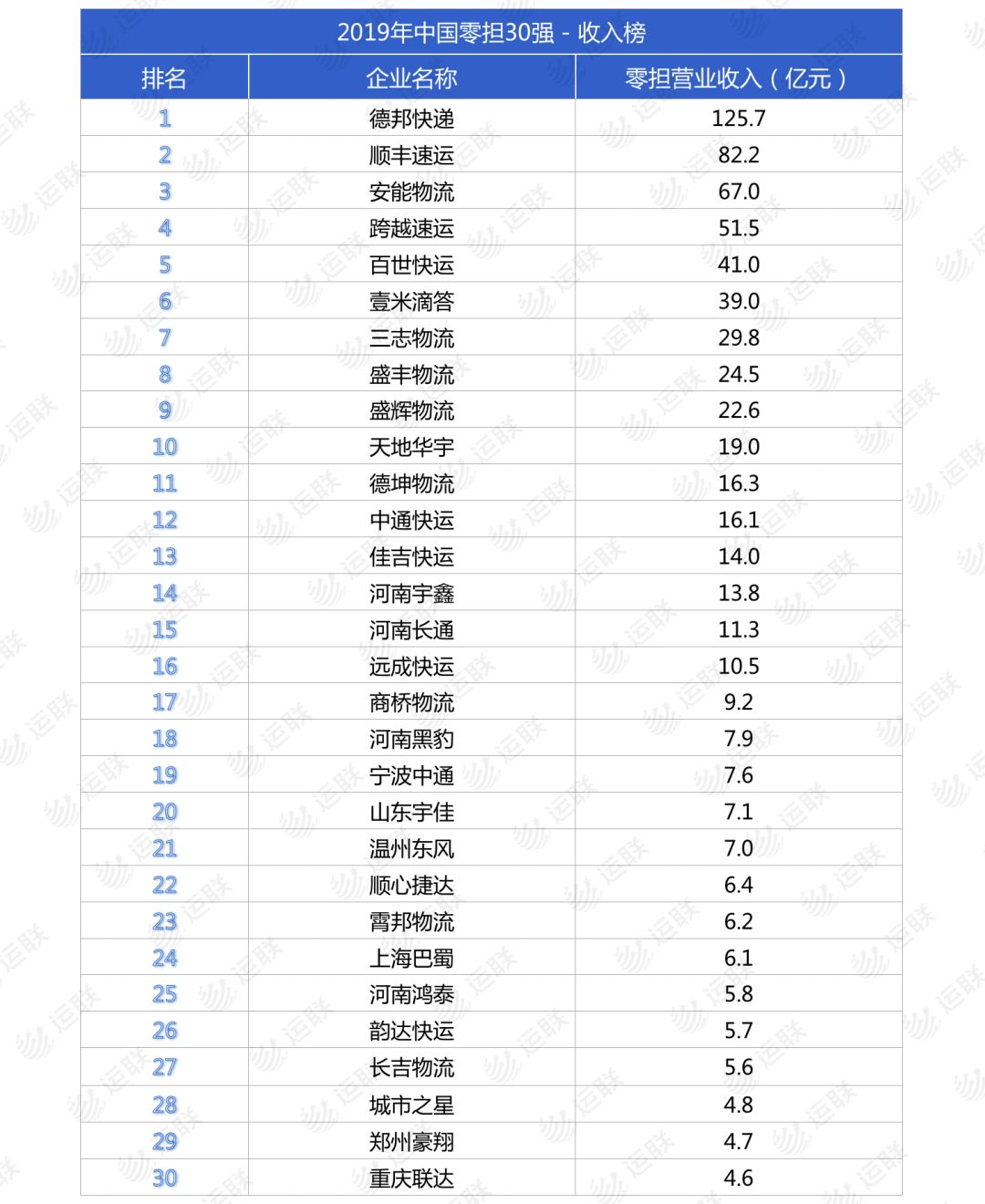 2019年中國(guó)零擔(dān)30強(qiáng)排行榜